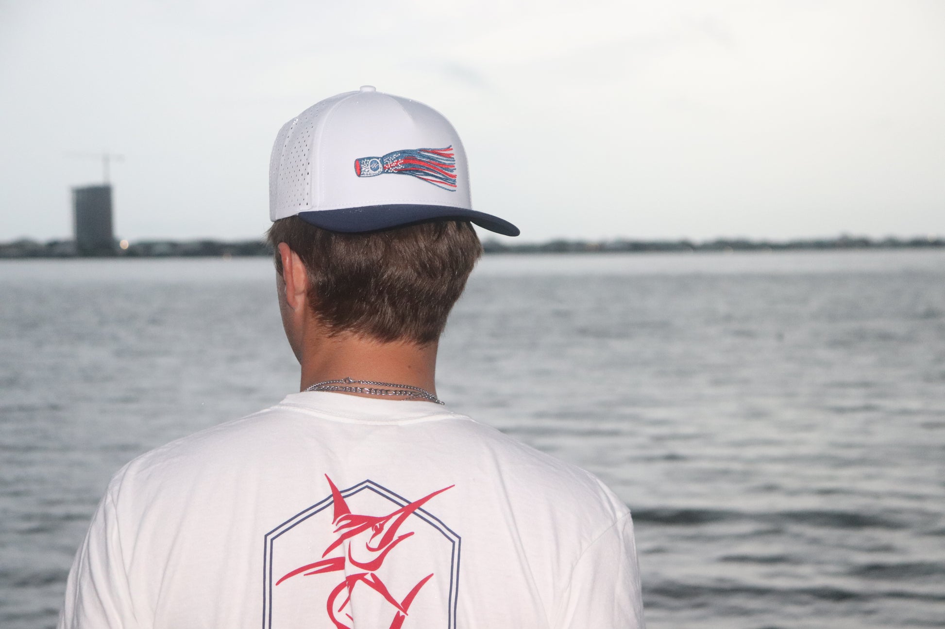 Designed on a high-performance blank with a structured front, breathable perforated mesh sides, and a classic snapback closure, The Freedom Lure delivers comfort and ventilation when the bite heats up. Whether you’re chasing marlin offshore or repping the red, white & blue around town, this hat does it all.